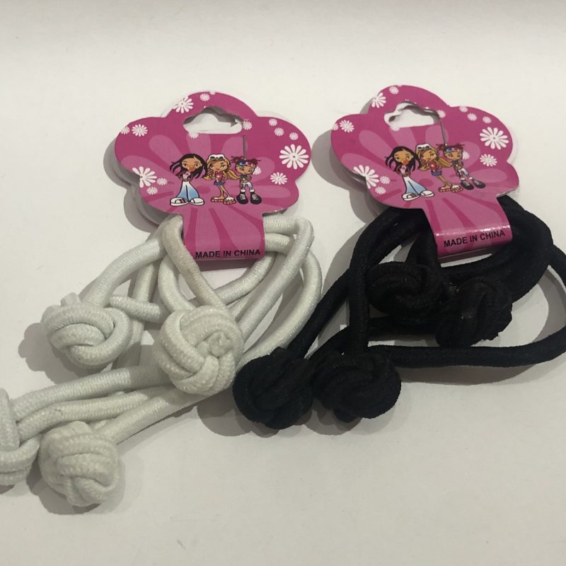 Blister con 4 LIGAS con NUDO negro o blanco, el blister en forma de flor rosa con tres monas adolescentes, individual.